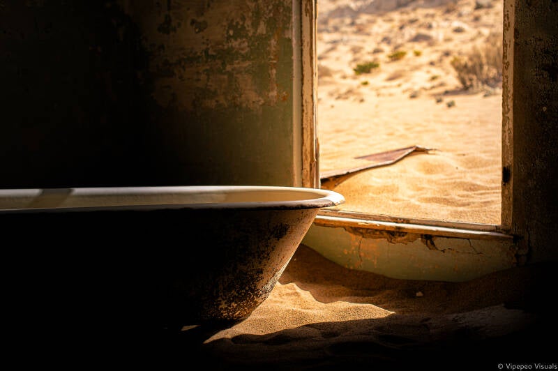Anyway, after about 50 years the diamond production had dropped to about zero and most mining activity had already moved away. The town was abandoned and left there for the brown hyenas and other desert animals to call it their home. In the decades after that, due to the strong wind and the lack of maintenance, the decaying town is covered in sand, as if it is being eaten by the desert. Some rooms are filled with sand almost to the roof.